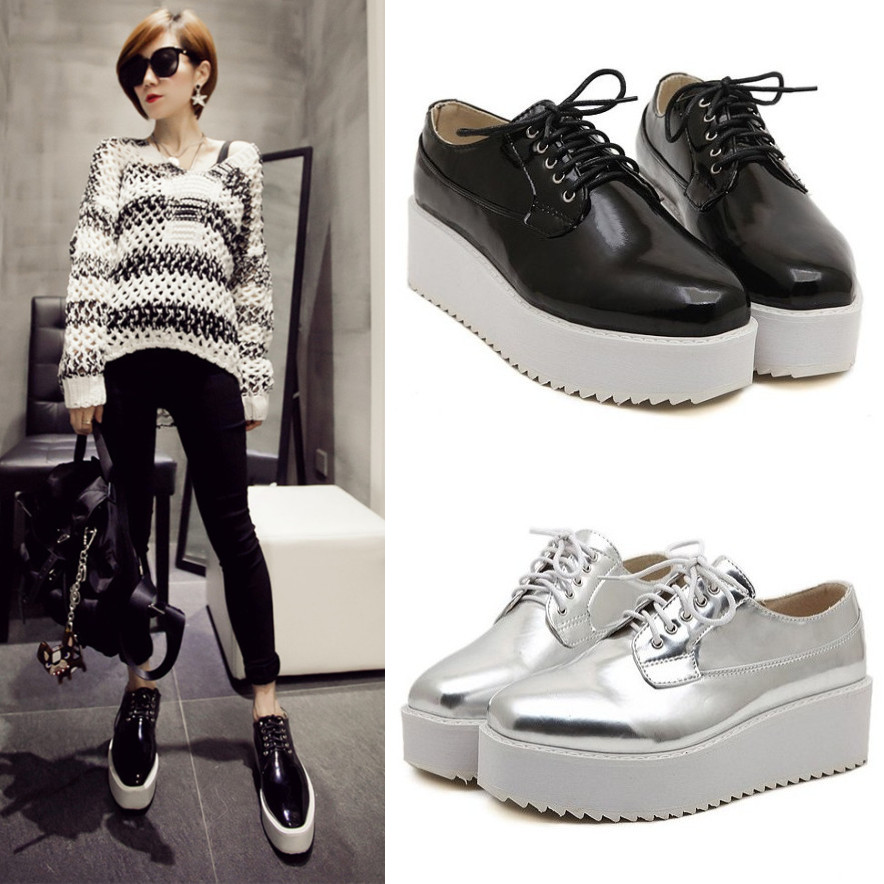 • Silver Spring College Korean version of the new patent leather shoes thick crust muffin square head lace low to help casual shoes with flat